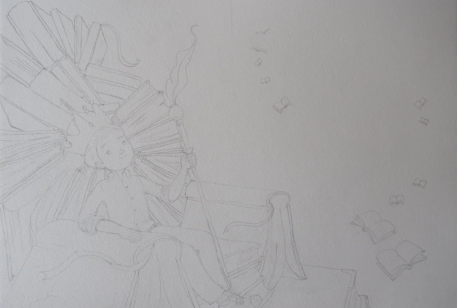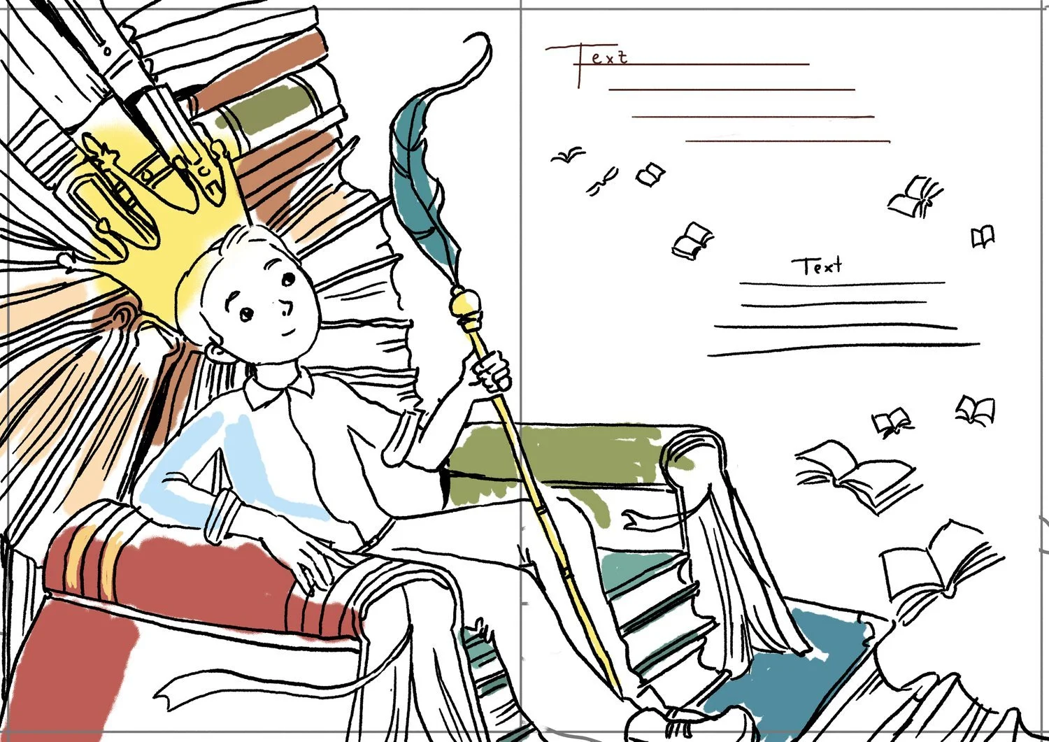The sketches are designed in a way to frame the text and allow for the necessary space to add the rhyme. In some scenes, such as the scene with the throne of books, design elements have been added to further elegantly frame the text to enhance it.