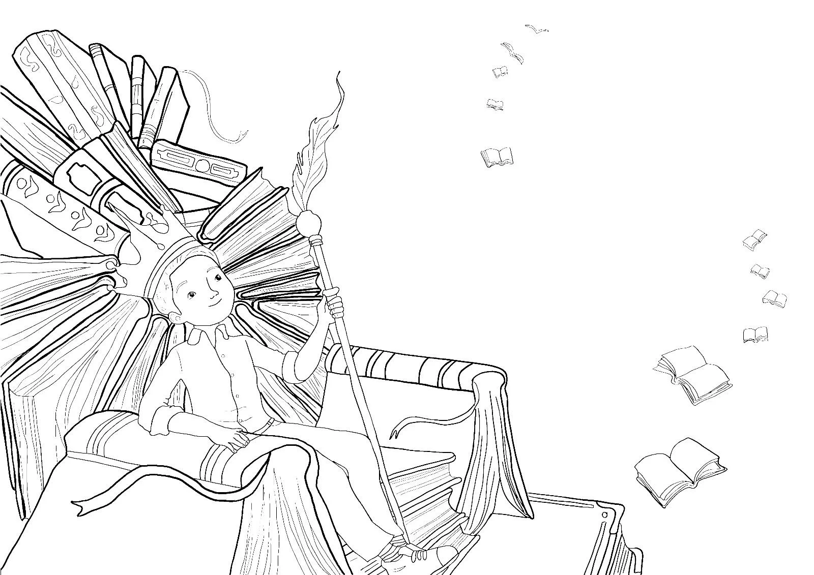 Download the colouring page of the scene with the throne of books and either replicate it or paint it with your own colours.